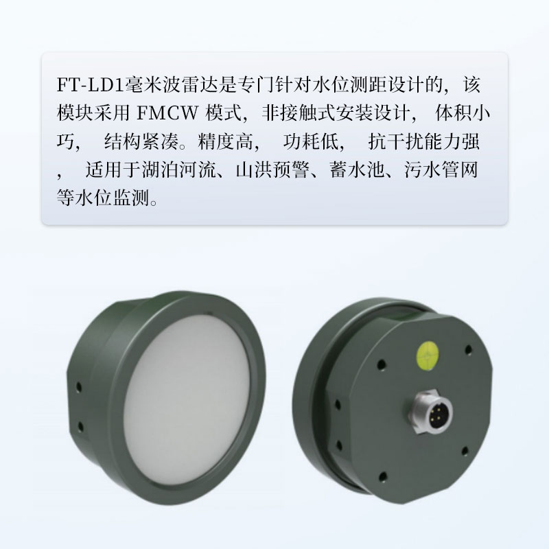 【产品简介】1、平板雷达水位计产品概述平板雷达水位计是专门针对水位测距设计的,该模块采用FMCW模式,非接触式安装设计,体积小巧,结构紧凑。精度高,功耗低,抗干扰能力强,适用于湖泊河流、山洪预···