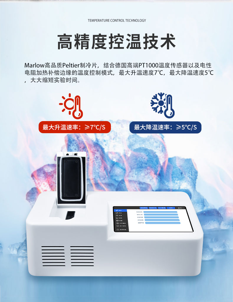3.Marlow高品质Peltier制冷片,结合德国高端PT1000温度传感器以及电性电阻加热补偿边缘的温度控制模式,最大升温速度7℃,最大降温速度5℃,大大缩短实验时间。